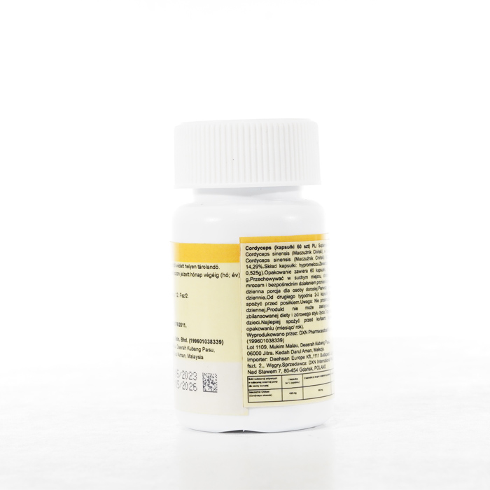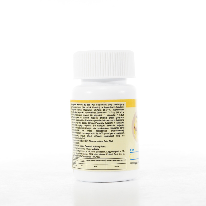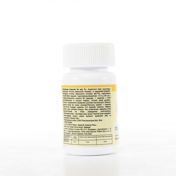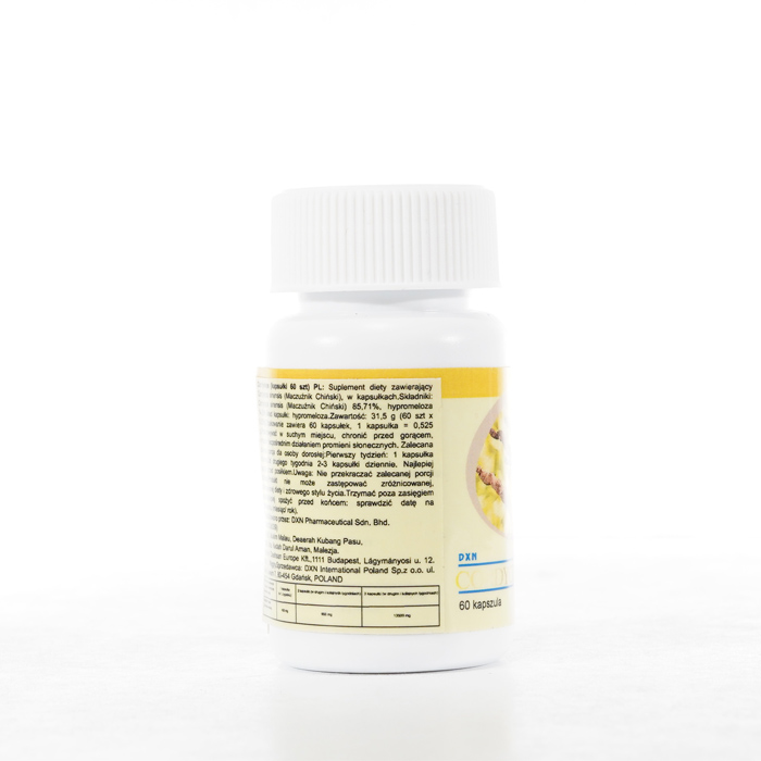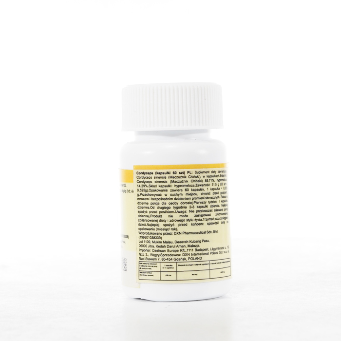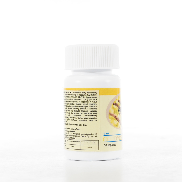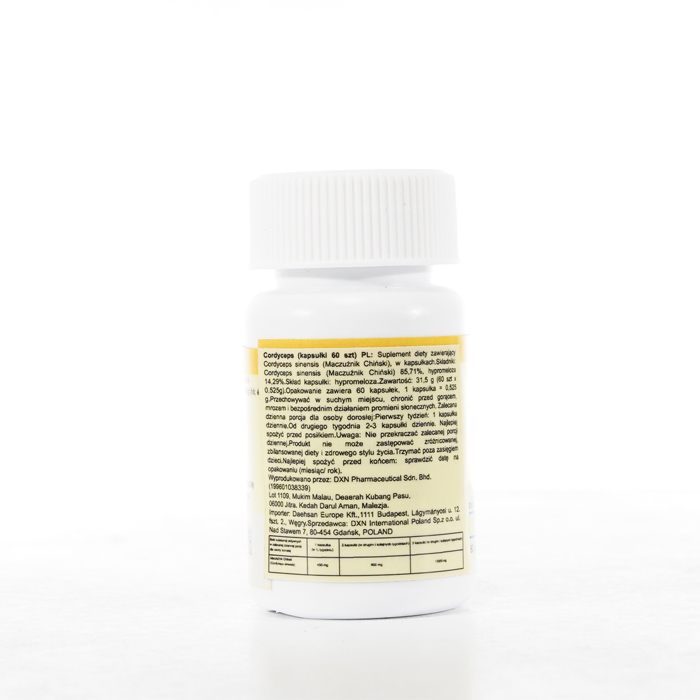 DXN Cordyceps nieustannie gwarantuje świeżość. Zdecydowanie zalecamy zapoznanie się z etykietami i instrukcjami dotyczącymi wszystkich towarów przed ich użyciem, a nie poleganie wyłącznie na informacjach dostarczonych przez DXN. Opis produktu nie został zweryfikowany przez odpowiednie organy. Ten produkt nie jest przeznaczony do leczenia, łagodzenia skutków lub zapobiegania jakimkolwiek chorobom.
