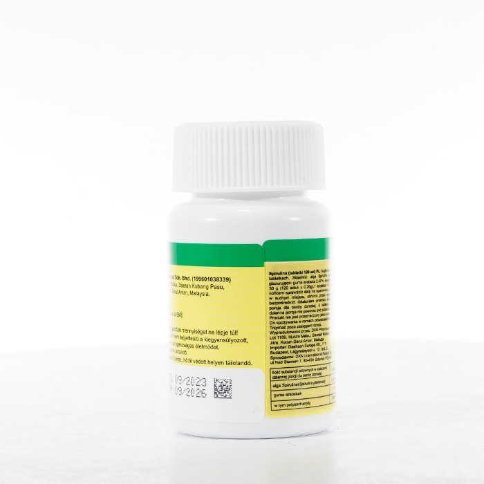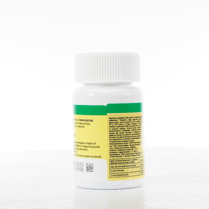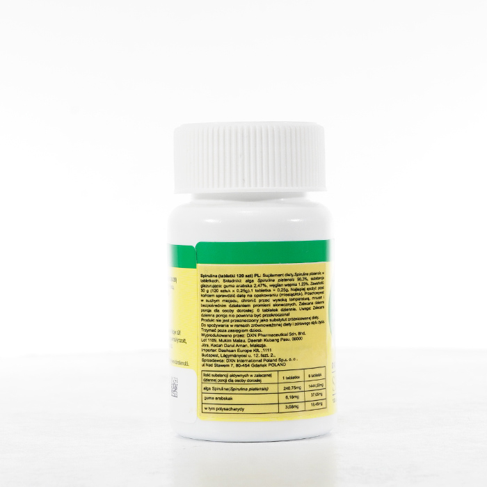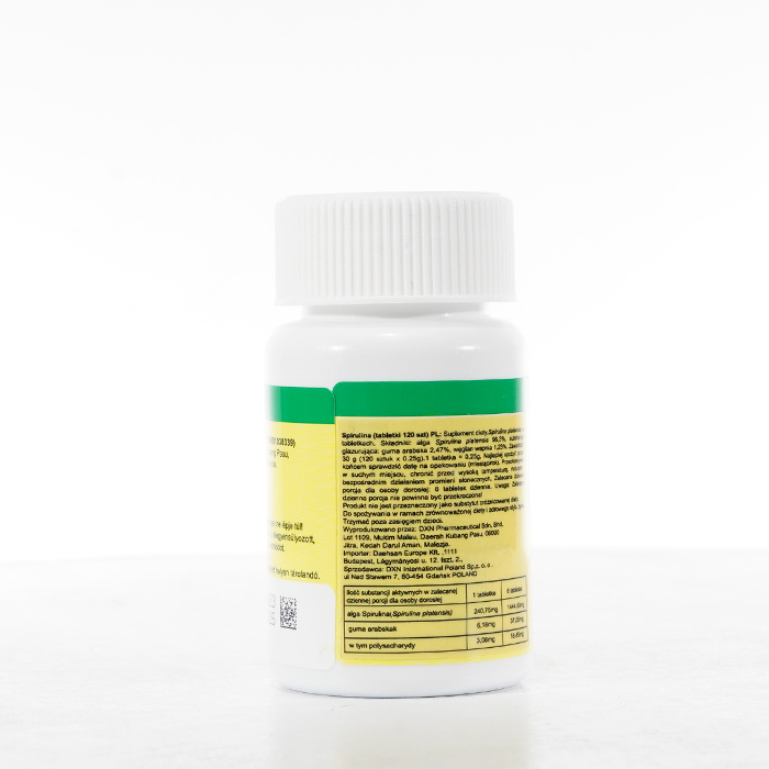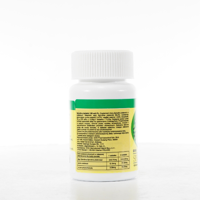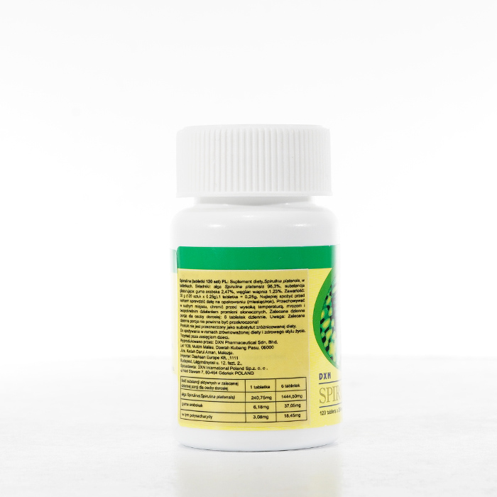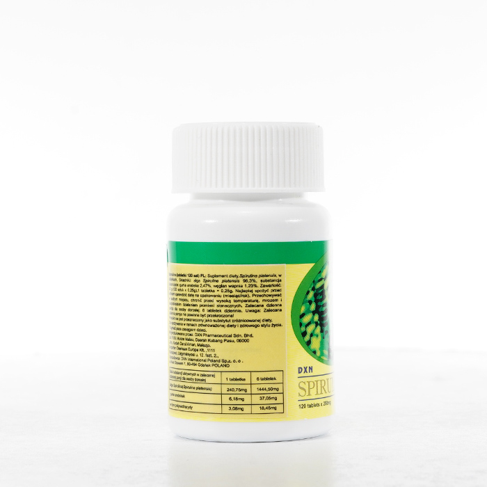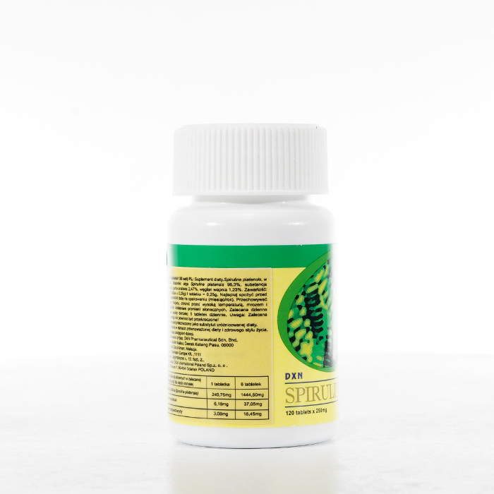 DXN Spirulina nieustannie gwarantuje świeżość. Zdecydowanie zalecamy zapoznanie się z etykietami i instrukcjami dotyczącymi wszystkich towarów przed ich użyciem, a nie poleganie wyłącznie na informacjach dostarczonych przez DXN. Opis produktu nie został zweryfikowany przez odpowiednie organy. Ten produkt nie jest przeznaczony do leczenia, łagodzenia skutków lub zapobiegania jakimkolwiek chorobom.