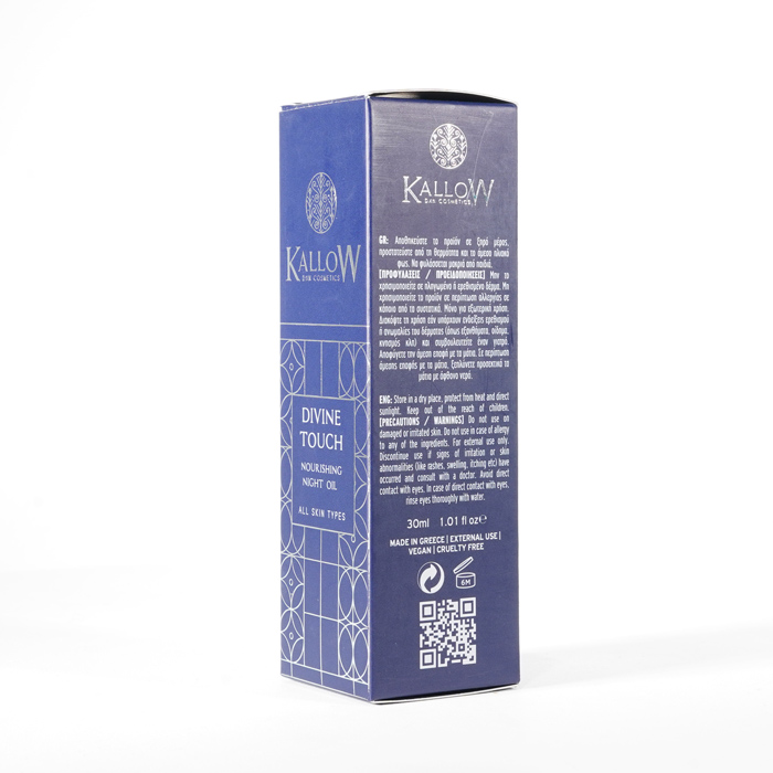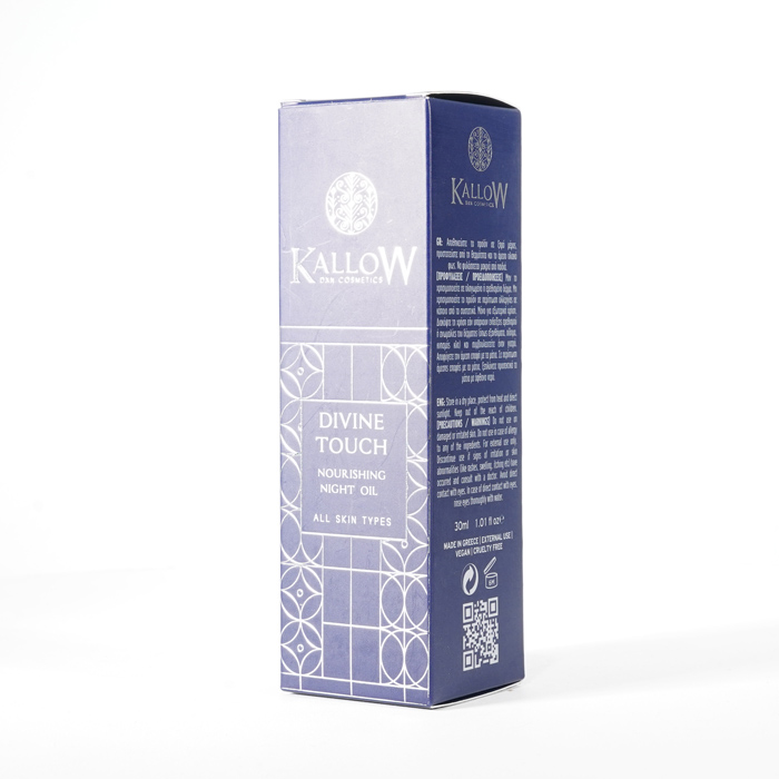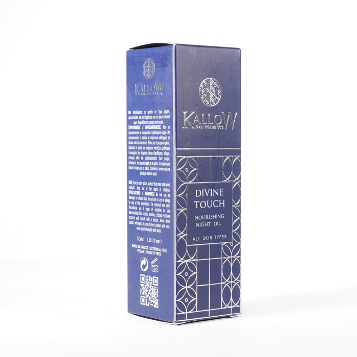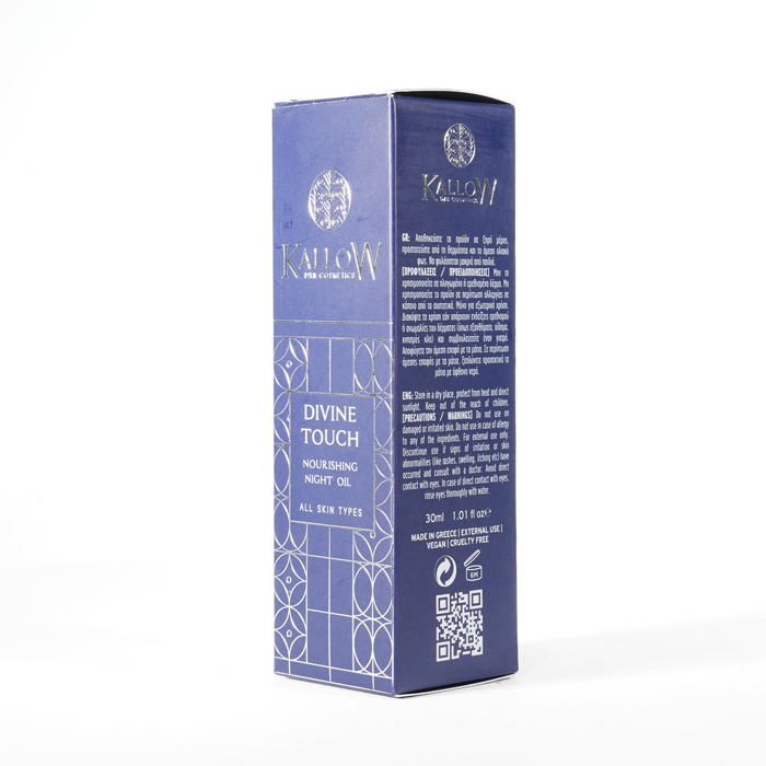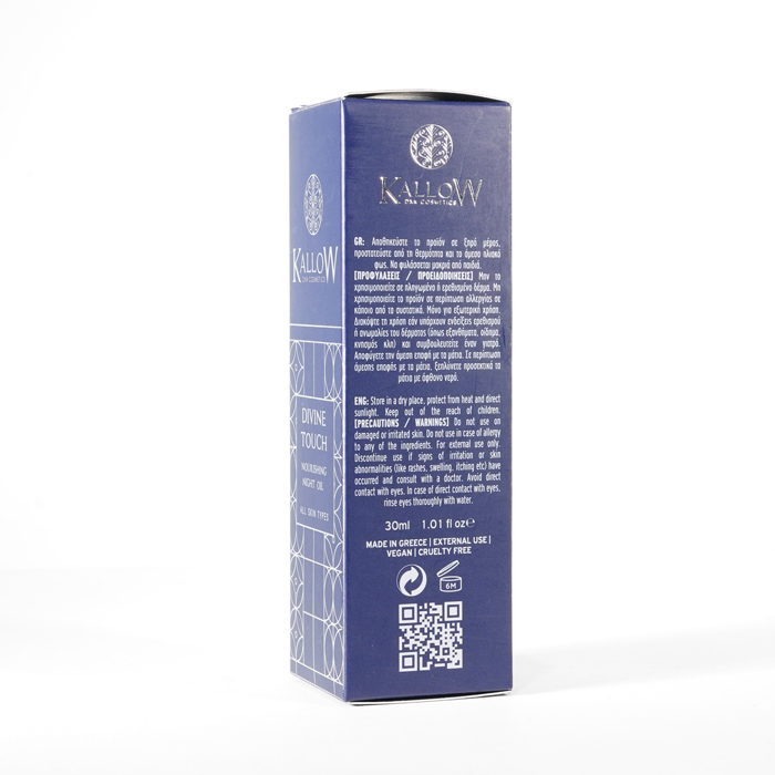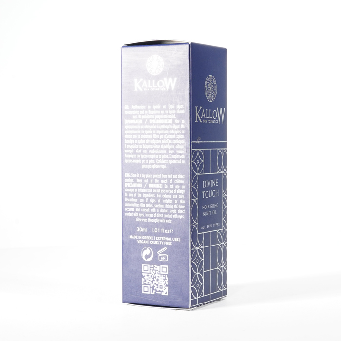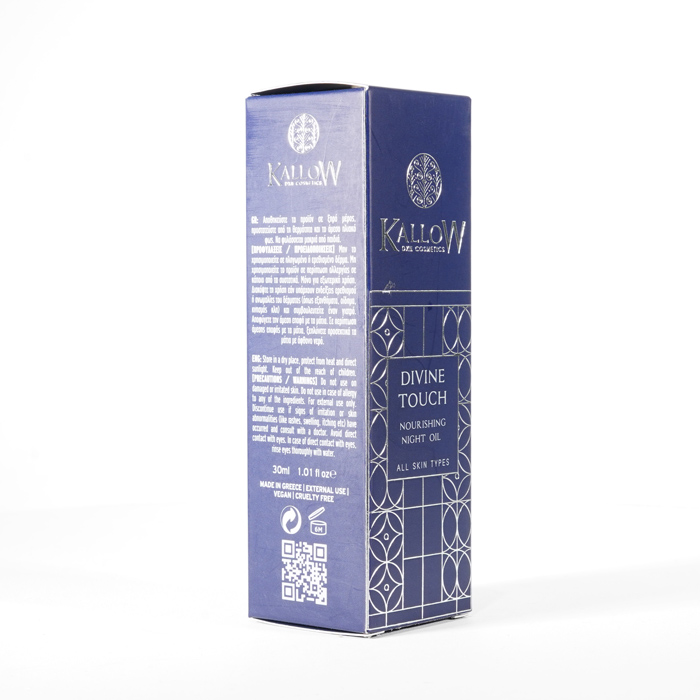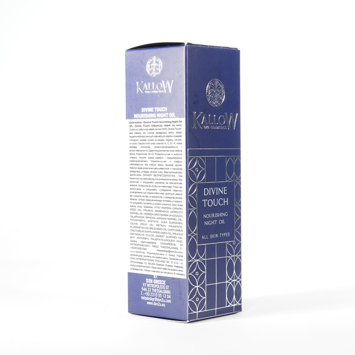 Odżywczy olejek na noc Divine Touch wyróżnia się cudowną mieszanką cennych naturalnych olejków, takich jak olej z pestek winogron, olej z pestek moreli, olej z awokado, olej arganowy, olej z oliwek, olej z owoców Sacha Inchi i niezbędne witaminy Α, C, E i F. Ta superkombinacja zapewnia promienną, świetlistą skórę, dzięki czemu stanowi idealny wybór do nocnej pielęgnacji skóry, obiecując prawdziwie boski dotyk.
