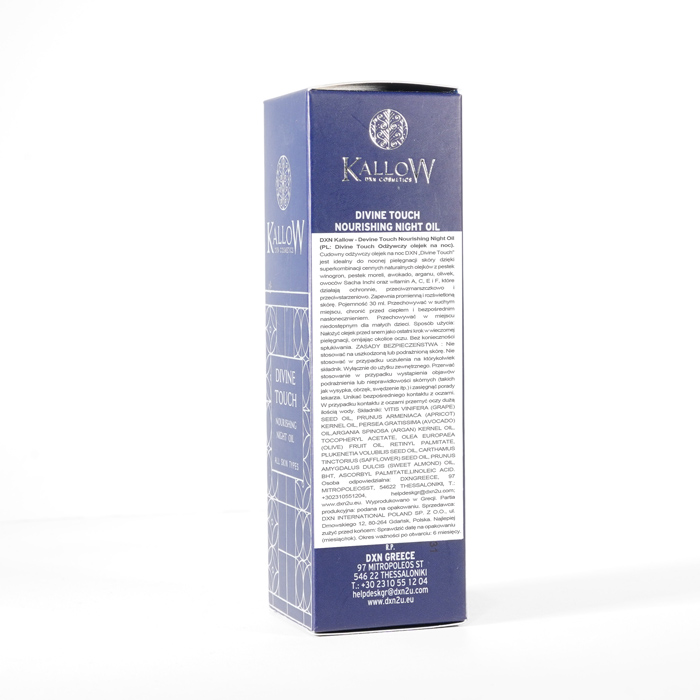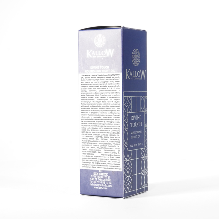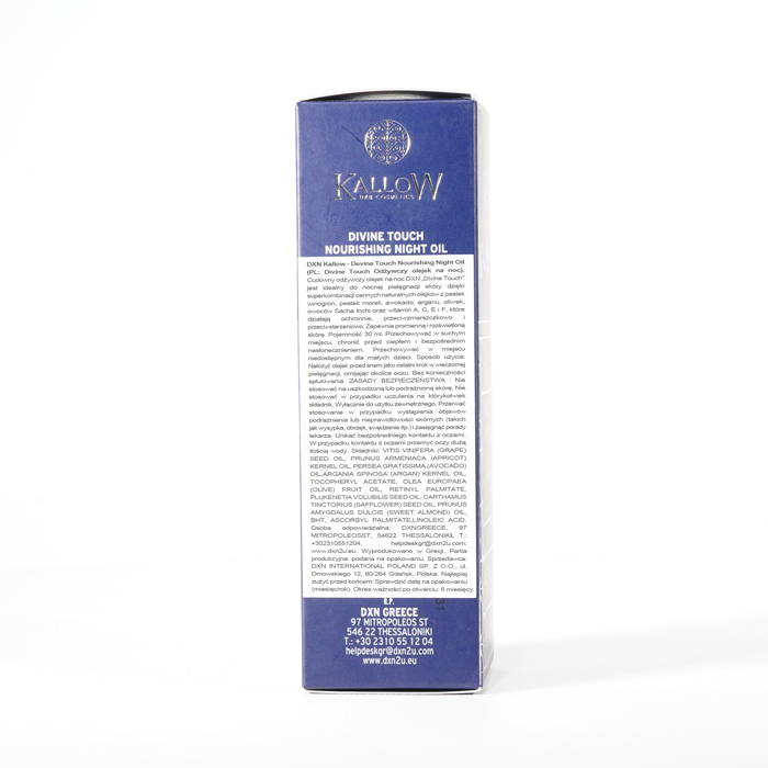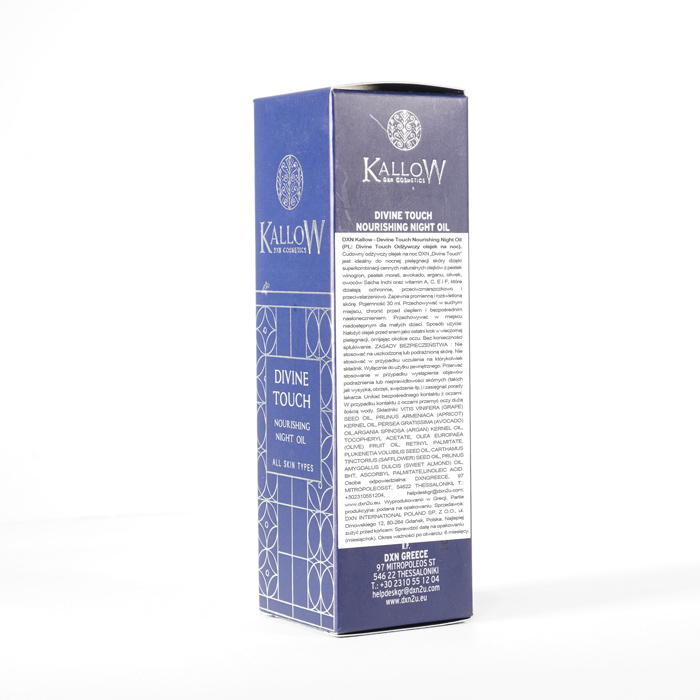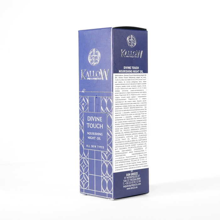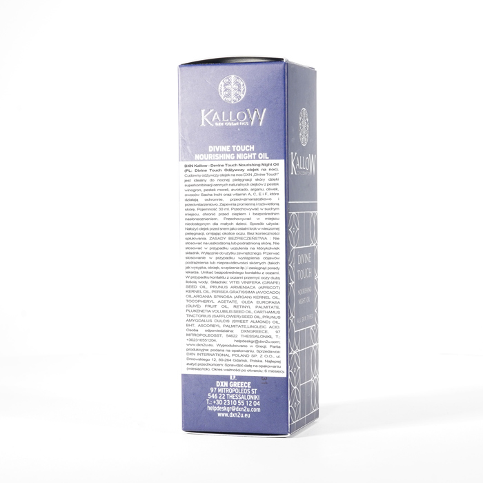 DXN Kallow - Divine Touch Odżywczy Olejek na Noc nieustannie gwarantuje świeżość. Zdecydowanie zalecamy zapoznanie się z etykietami i instrukcjami dotyczącymi wszystkich towarów przed ich użyciem, a nie poleganie wyłącznie na informacjach dostarczonych przez DXN. Opis produktu nie został zweryfikowany przez odpowiednie organy. Ten produkt nie jest przeznaczony do leczenia, łagodzenia skutków lub zapobiegania jakimkolwiek chorobom.
